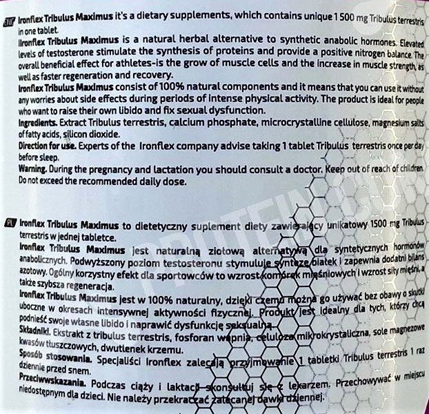 IronFlex Tribulus Maximus містить високу концентрацію 1500 мг трибулус террестрис в одній таблетці. Добавка є натуральною рослинною альтернативою синтетичним анаболічним гормонам. У такому дозуванні добавка підвищує рівень тестостерону до максимальних значень і як результат для атлетів – зростання м'язових клітин та збільшення м'язової сили, а також швидша регенерація та відновлення. Продукт також ідеально підійде тим, хто хоче підняти власне лібідо та виправити сексуальну дисфункцію.