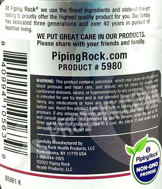 Piping Rock Vi-Max "MEN ONLY" Male Formula включає в себе Йохимбе і не тільки. Ця запатентована Piping Rock формула складається з інгредієнтів преміум-класу, таких як маку, муіра пуама, трибулус, корейський женьшень і інші трави.