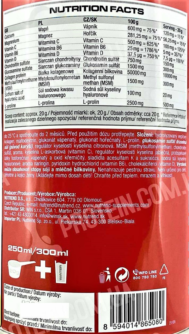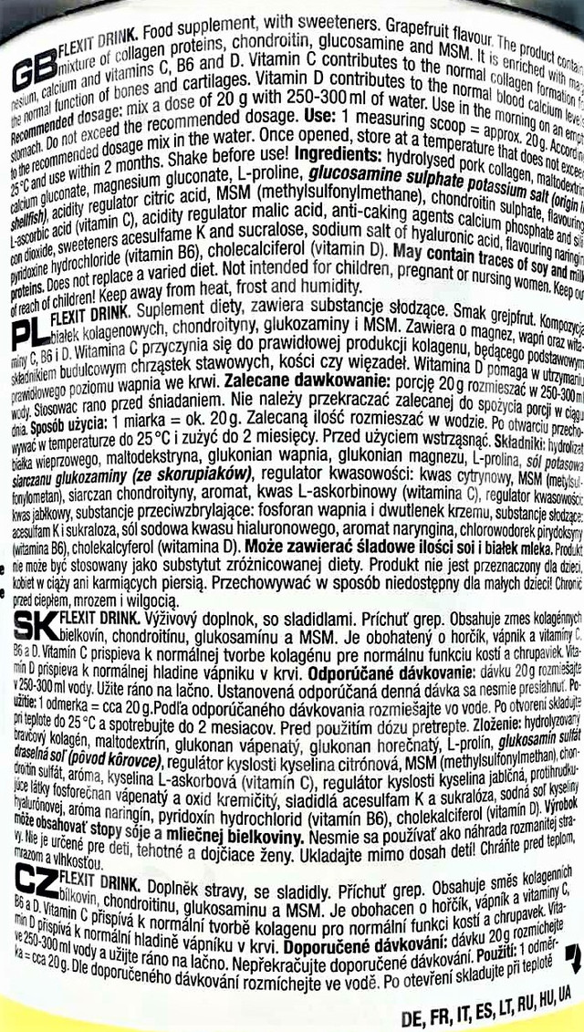 Nutrend Flexit Drink – якісна харчова добавка, що підтримує здоров'я суглобів, зв'язок і кісткових тканин. Nutrend Flexit Drink показаний людям з порушенням рухливості суглобів, при надлишковій масі тіла та великих фізичних навантаженнях, а також особам, які споживають недостатн кількість кальцію. Клінічні дослідження показали високу ефективність даного препарату у спортсменів. Nutrend Flexit Drink містить кальцій і магній, що перешкоджають виникненню остеопорозу, вітаміни С, В6, D3, що сприяють відновленню тканин, а також глюкозамін та хондроїтин сульфат, що допомагають формуванню хрящових тканин.